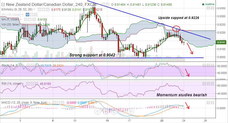 NZD/CAD upside has been capped at 0.9226, and has edged lower to currently trade at 0.9140.