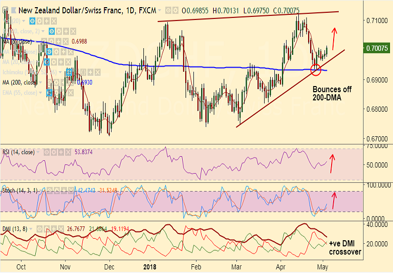 - NZD/CHF is extending upside after bouncing off 200-DMA at 0.6930, bias higher.