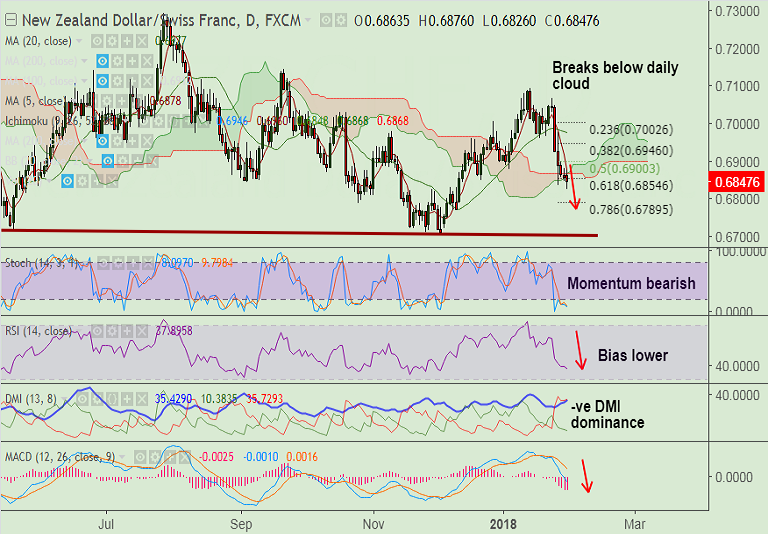 - NZD/CHF has shown a decisive break below daily cloud, bias bearish.