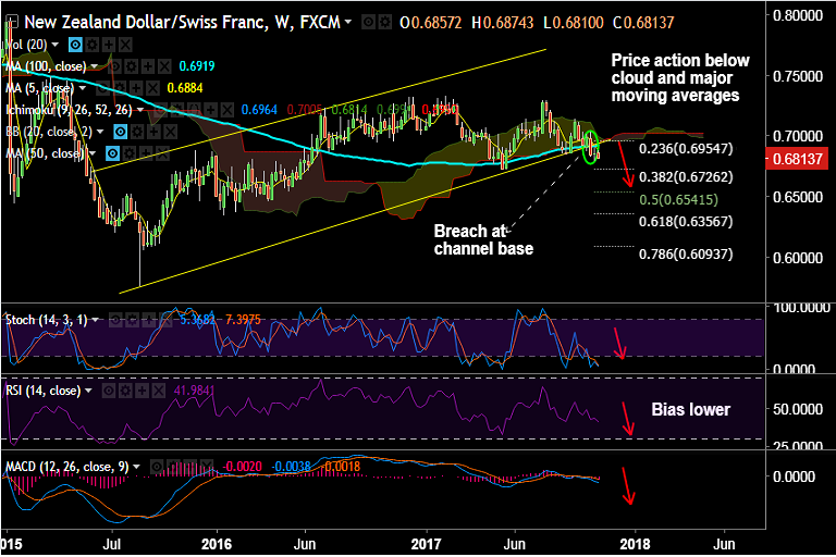 - The pair is extending breach at channel base and remains capped below weekly 100-SMA.