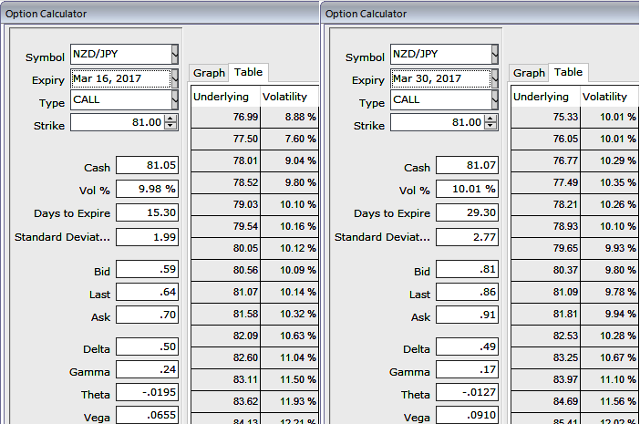 The strategy goes this way: while you're holding longs in spot FX of NZDJPY, go short in 2W (1.5%) OTM striking call and long in 1m (1%) OTM striking put. Since the short term, bullish sentiments are mounting we kept upside bracket little on the higher side.