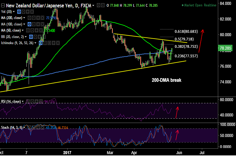 - NZD/JPY spikes past 200-DMA at 77.97 to hit fresh highs for the week at 78.33.