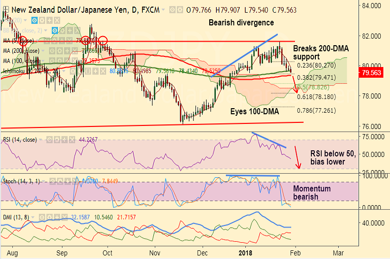 - The pair slipped below 200-DMA at 79.66, to hit new 5-week lows at 79.52.