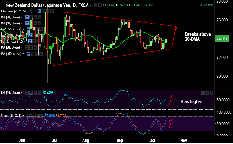 - NZD/JPY trades 0.66 percent higher on the day, break 20-DMA resistance at 73.70.