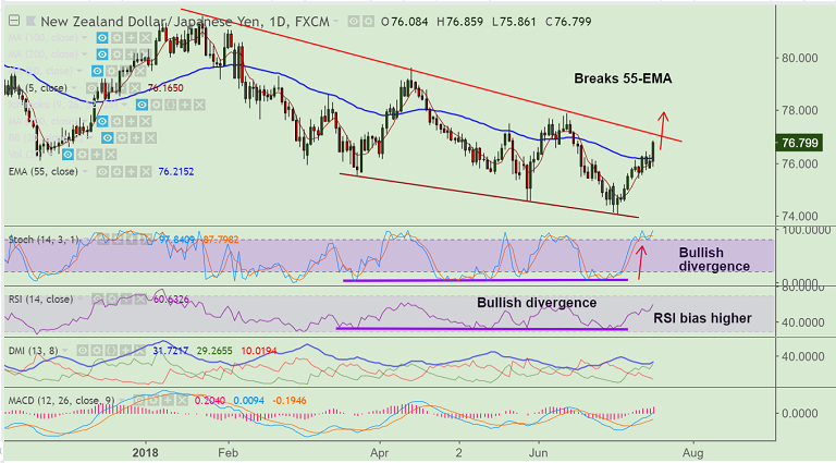- NZD/JPY has spiked past 55-EMA at 76.21, trades 0.95% higher on the day.