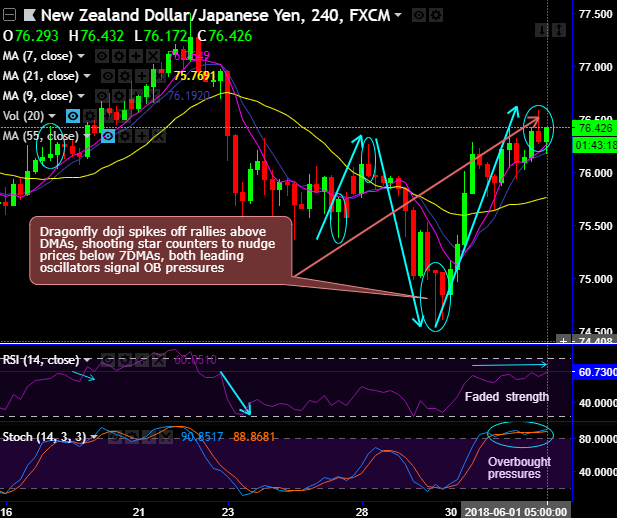 NZDJPY forms dragonfly doji on minor trend at 75.060 levels that is spiking off rallies above DMAs, whereas shooting star counters at 76.293 levels to nudge prices below 7DMA levels which is bearish in nature both leading and lagging indicators have been indecisive but signal overbought pressures (refer 4H chart).
