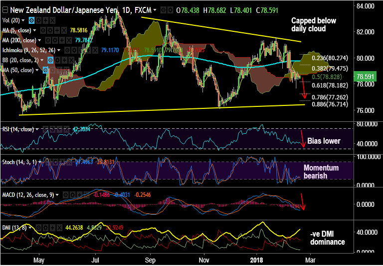- Daily Ichimoku cloud weighs heavily on the upside, we see major resistance by cloud base at 78.70.