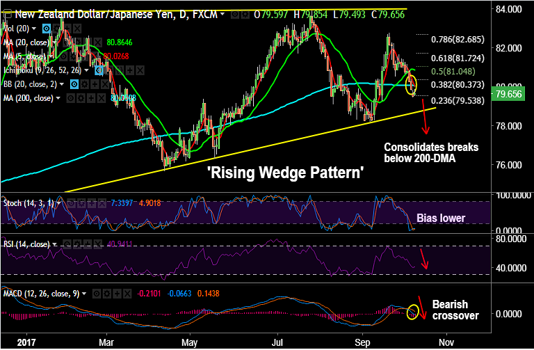 - NZD/JPY is consolidating a break below 200-DMA, intraday bias lower.