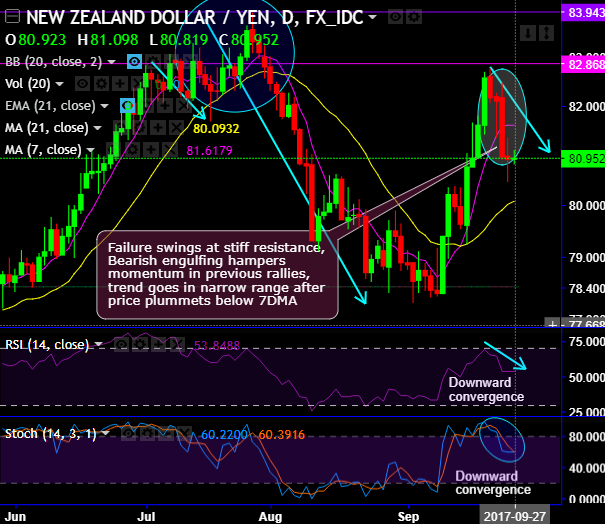 Historically, the upswings are exhausted at the stiff resistance of 83.929-82.868 levels, resembling bearish engulfing candle has occurred at 80.979 levels that has evidenced slumps below 7DMA (refer daily chart).