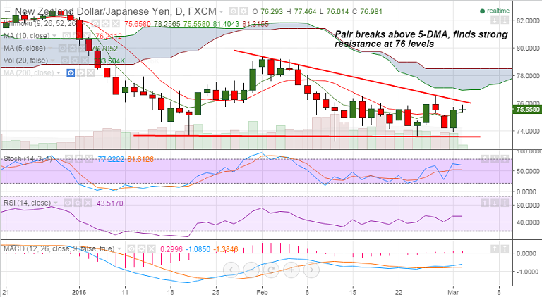 - The pair has broken above 5-DMA at 75.34 but further gains ca be seen only on breaks above 76 levels.
