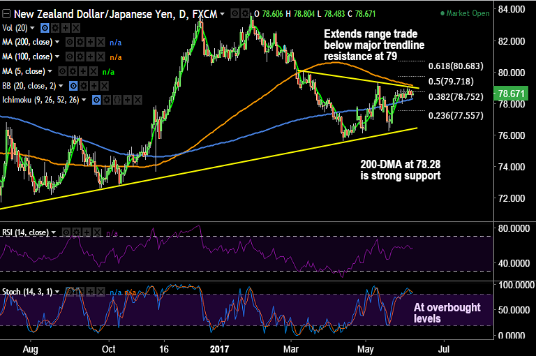 - NZD/JPY largely muted, finds stiff resistance on the upside at 79 levels (major trendline).