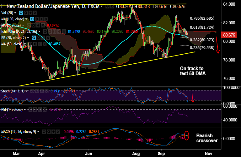 - The pair is trading a 'Rising Wedge' pattern and close below 50-DMA raises scope for test of Wedge base at 78.75.