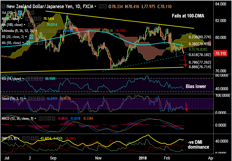 - NZD/JPY fails at 100-DMA, retraces break above, slips lower with gravestone Doji formation.