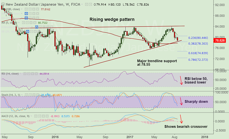 - The pair finds major support at 78.55 which is wedge base. We see further weakness on break below.