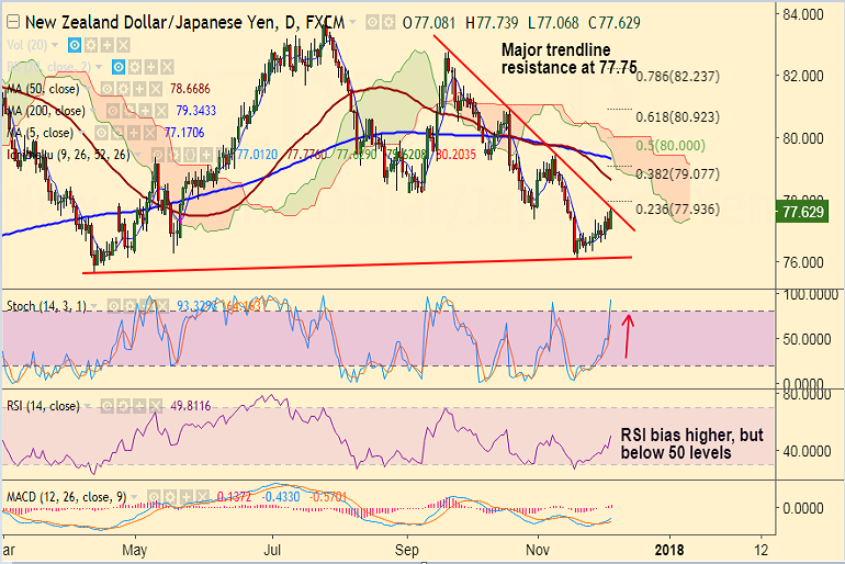 - NZD/JPY pivotal around major trendline resistance at 77.75, only decisive breakout to see further upside.