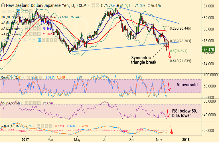 - NZD/JPY has hit fresh 7-month lows at 76.09 before paring some losses to currently trade at 76.40 levels.