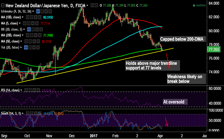 - NZD/JPY has broken below 200-DMA at 77.39, but downside is holding major trendline support at 77 levels.