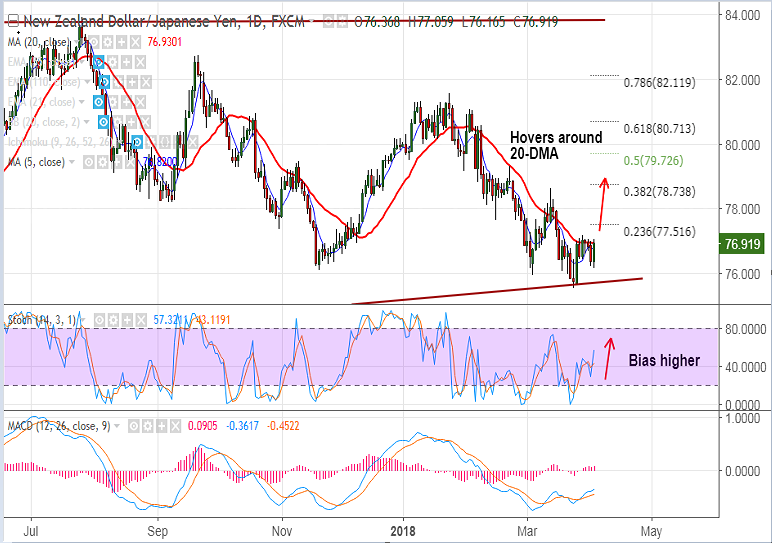- The pair is currently hovering around 20-DMA at 76.93, intraday bias remains higher.