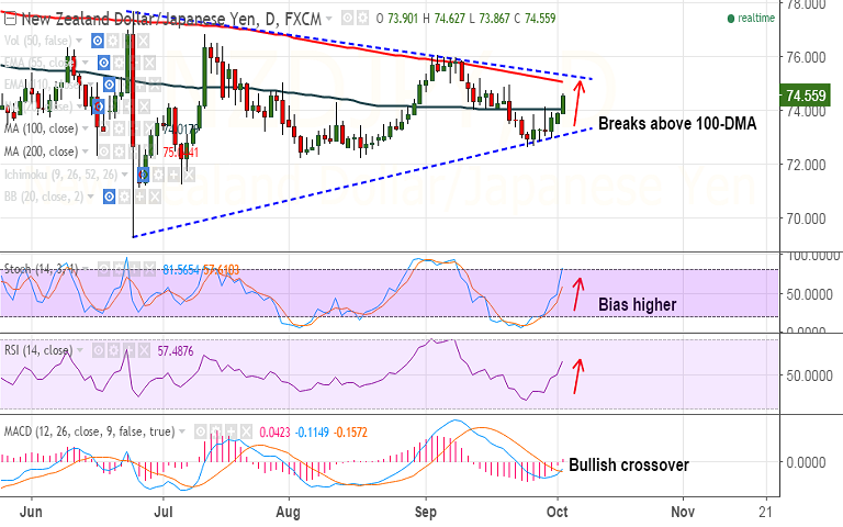 - NZD/JPY break major resistance 100-DMA 74.01 and 20-DMA at 74.16, intraday bias higher.