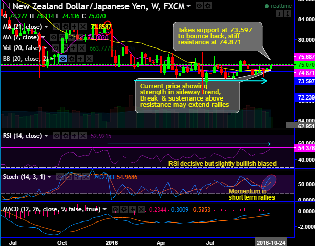 This week, the pair takes support at 73.597 levels to bounce back, but stiff resistance seen at 74.871 marks, encourage the short bullish environment but the major downtrend should not be ruled out.