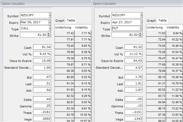 The strategy goes this way: while you're holding longs in spot FX of NZDJPY, go short in 2W (1.5%) OTM striking call and long in 2m (1%) OTM striking put. Since the short term, bullish sentiments are mounting we kept upside bracket little on the higher side.