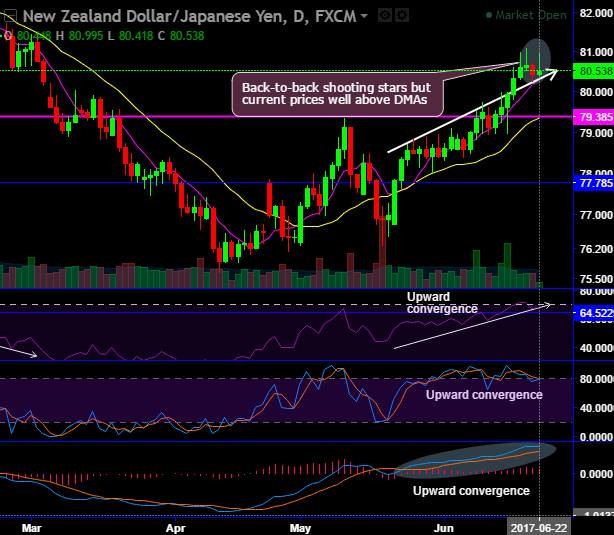 Shooting star pops up at 80.69 and 80.55 levels but the weakness is not signaled by leading or lagging indicator, they’re still bullish bias. As a result, the current prices keep spiking higher (refer daily charts).