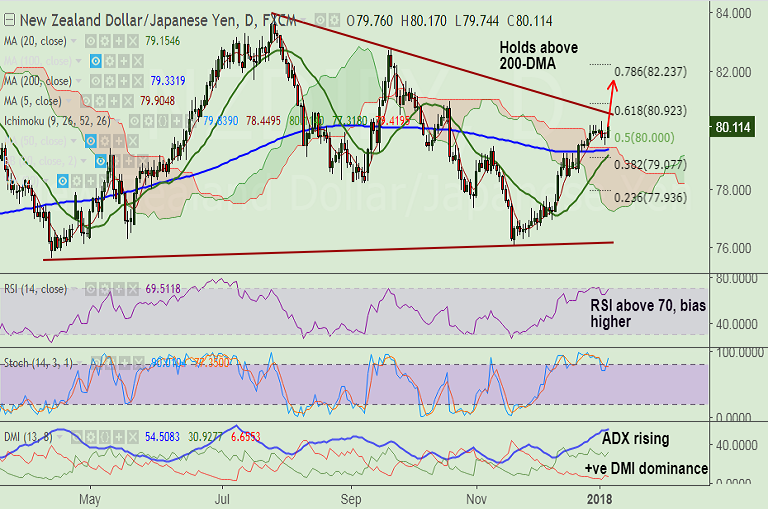 - Breakout at 80.60 could see further gains. While, on the flipside, retrace below 200-DMA at 79.33 negates bullish bias.