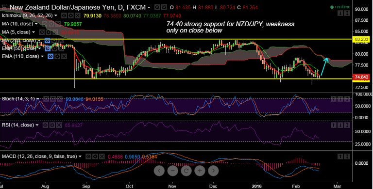 - 74.40 is a strong support levels for the pair, weakness only on close below Break below 74.40 could see next support at 73.65 (Jan 20th low), then 73.20 (Feb 11 lows) and 72.42 (Aug 24 lows).