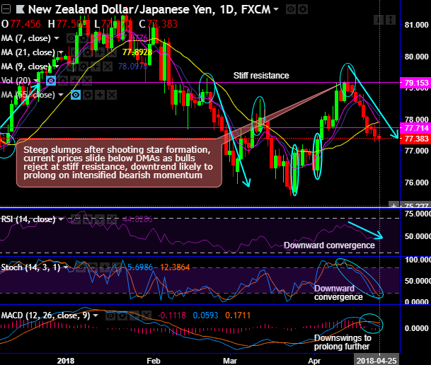 NZDJPY traders on minor trend are extending slumps after shooting star formation which is bearish in nature (refer daily chart).
