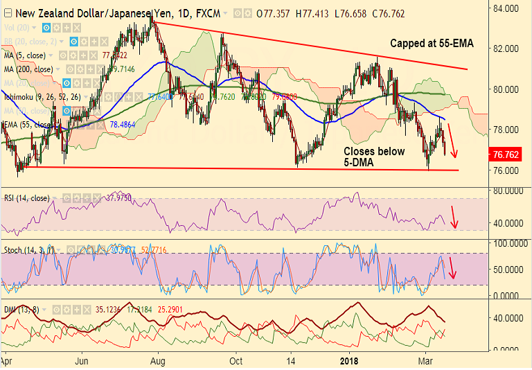 - NZD/JPY grinds lower after rejection at 55-EMA on Tuesday's trade.