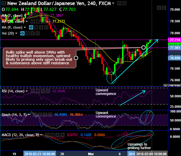 NZDJPY bulls spike well above SMAs with healthy bullish momentum, uptrend likely to prolong only upon break-out & sustenance above stiff resistance of 77.714 levels.