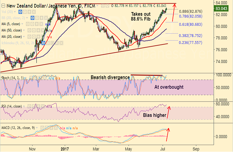 - The pair has broken 88.6% Fib retrace of 83.809 to 75.626 fall at 82.87, bias higher.
