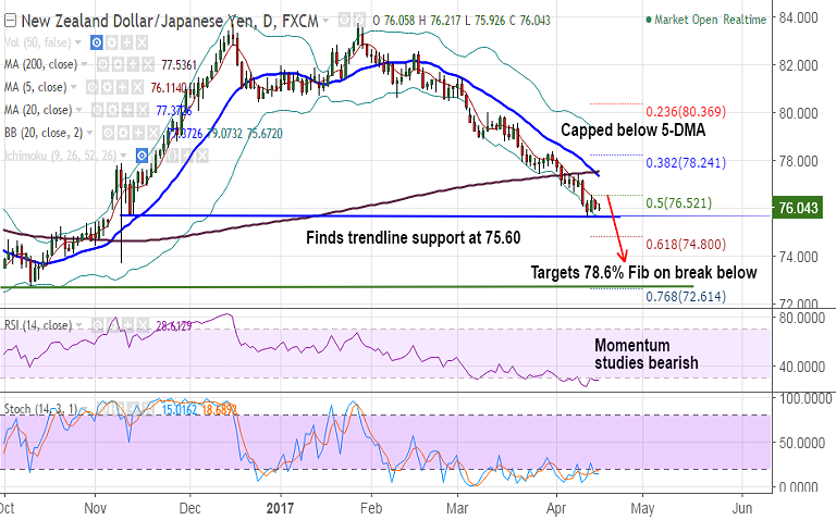 - 5-DMA currently at 76.10 weighs on the upside. The pair is extending grind lower along 5-DMA.