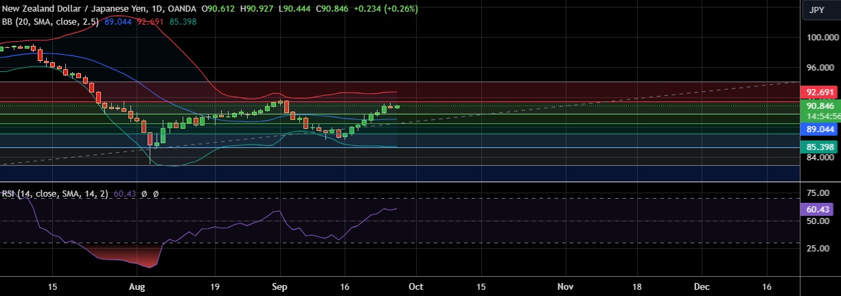 • Immediate resistance is located at 91.46(23.6%fib), any close above will push the pair towards 91.96 (Higher BB).