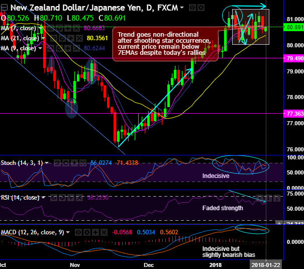 NZDJPY forms shooting stars on 81.136 on the daily chart and 82.803 levels on monthly plotting.