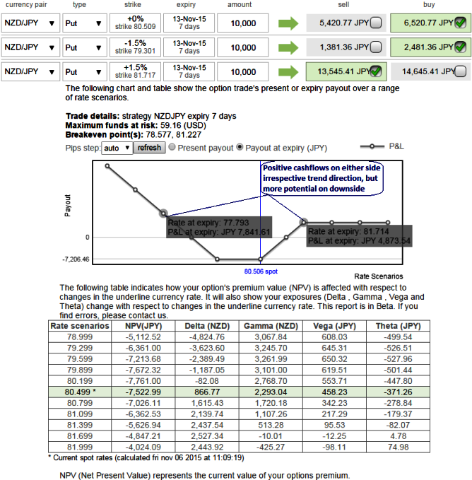 Maximum returns are limited to the extent of initial credit received if the NZDJPY rallies above the upper breakeven point (BEP) but large unlimited profit can be achieved should the underlying exchange rate of NZDJPY makes a vivid downswings below the lower BEP.