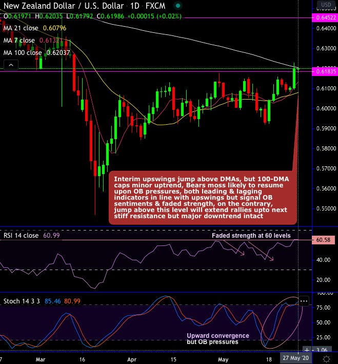 NZDUSD broke higher overnight, targeting next stiff resistance of 0.6265 and 0.6452 levels. Interim upswings jump above DMAs, but 100-DMA caps the prevailing minor uptrend (refer daily chart).