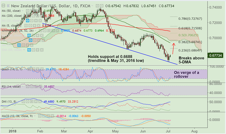 Support levels - 0.6755 (5-DMA), 0.6685 (trendline)