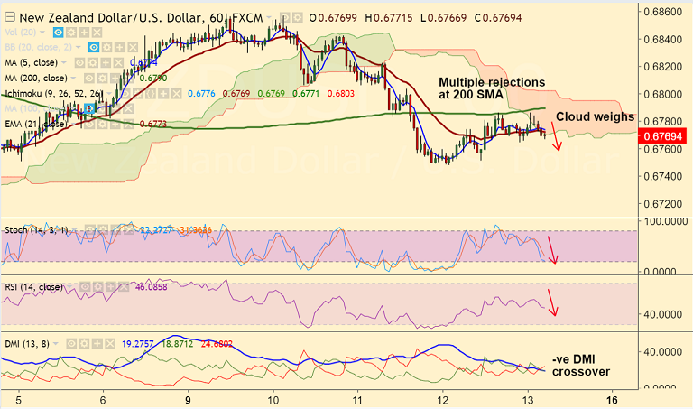 Resistance levels - 0.6790 (1H 200-SMA), 0.6796 (5-DMA), 0.6830 (21-EMA)
