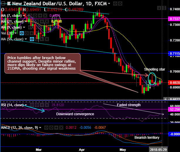 On daily plotting of NZDUSD, the price in minor trend has tumbled after breaching below channel support. For now, despite minor rallies, more dips likely on failure swings at 21DMA, while shooting star pattern candle has occurred at 0.6932 levels to signal further weakness.