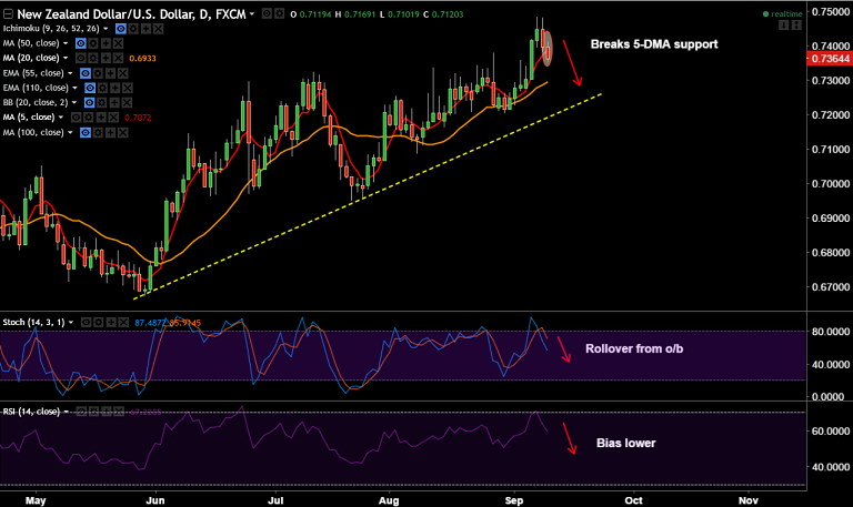 - Techs have turned bearish after break below 5-DMA support at 0.7383.