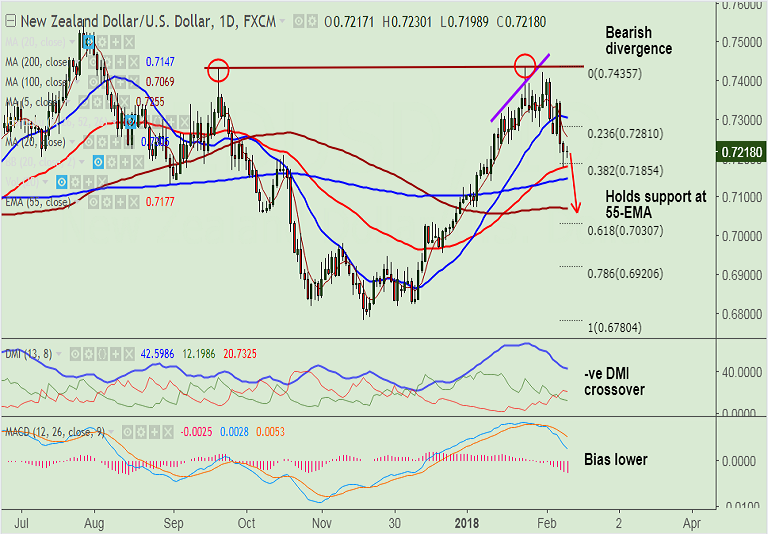 Support levels - 0.7185 (38.2% Fib retrace of 0.6780 to 0.7435 rally), 0.7176 (55-EMA), 0.7147 (200-DMA), 0.7069 (100-DMA)