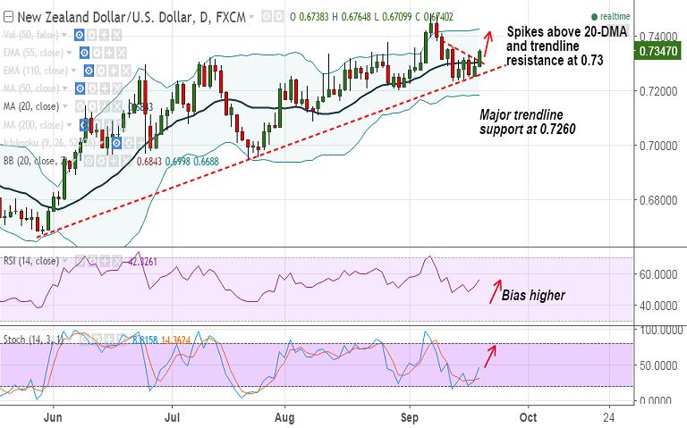 - The pair has broken above 20-DMA at 0.7305, we see scope for further gains.