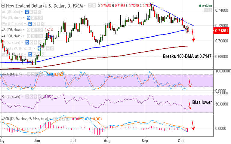 - NZD/USD breaks below 100-DMA at 0.7147 to hit fresh 4-week lows of 0.7125, intraday bias lower.
