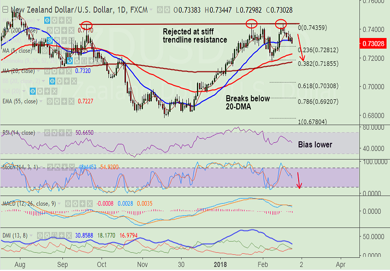 - The pair is extending downside after rejection at major trendline resistance, has slipped below 0.73 handle.