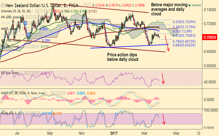 Support levels - 0.6972 (78.6% Fib retrace of 0.68621 to 0.73756 rally), 0.6920 (88.6% Fib), 0.6890 (Mar 9 low)