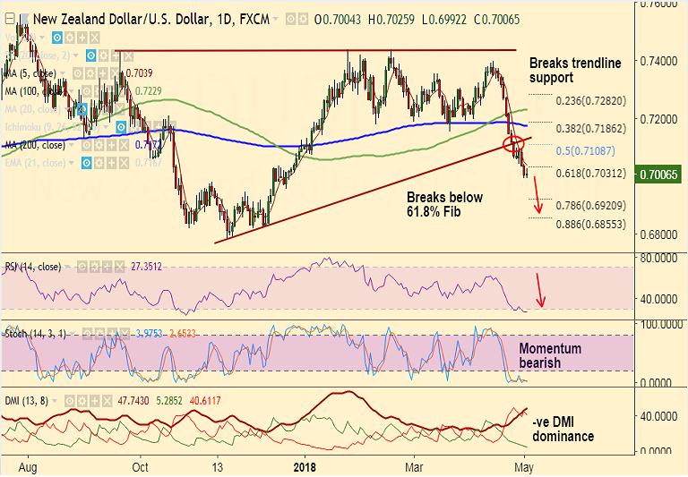 - NZD/USD breaks below 61.8% Fib at 0.7031, momentum bearish, bias lower.