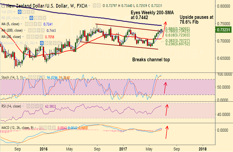 - Scope then for test of weekly 200-SMA at 0.7442. Technical indicators on weekly charts also support upside.