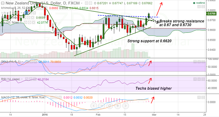 - The pair has broken all major resistances - at 0.6667 (triple top ), 0.67 and 0.6730 (trendline resistances).