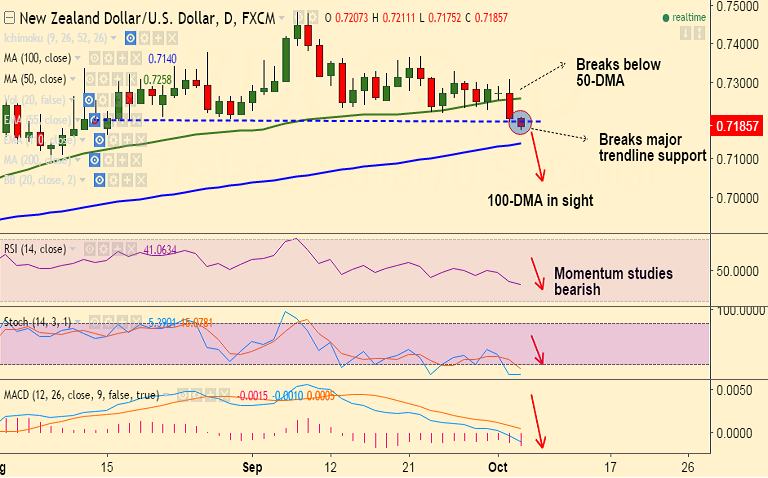 - The pair breached 50-DMA support on Tuesday and edged lower to break major trendline support which aligns at 0.72.